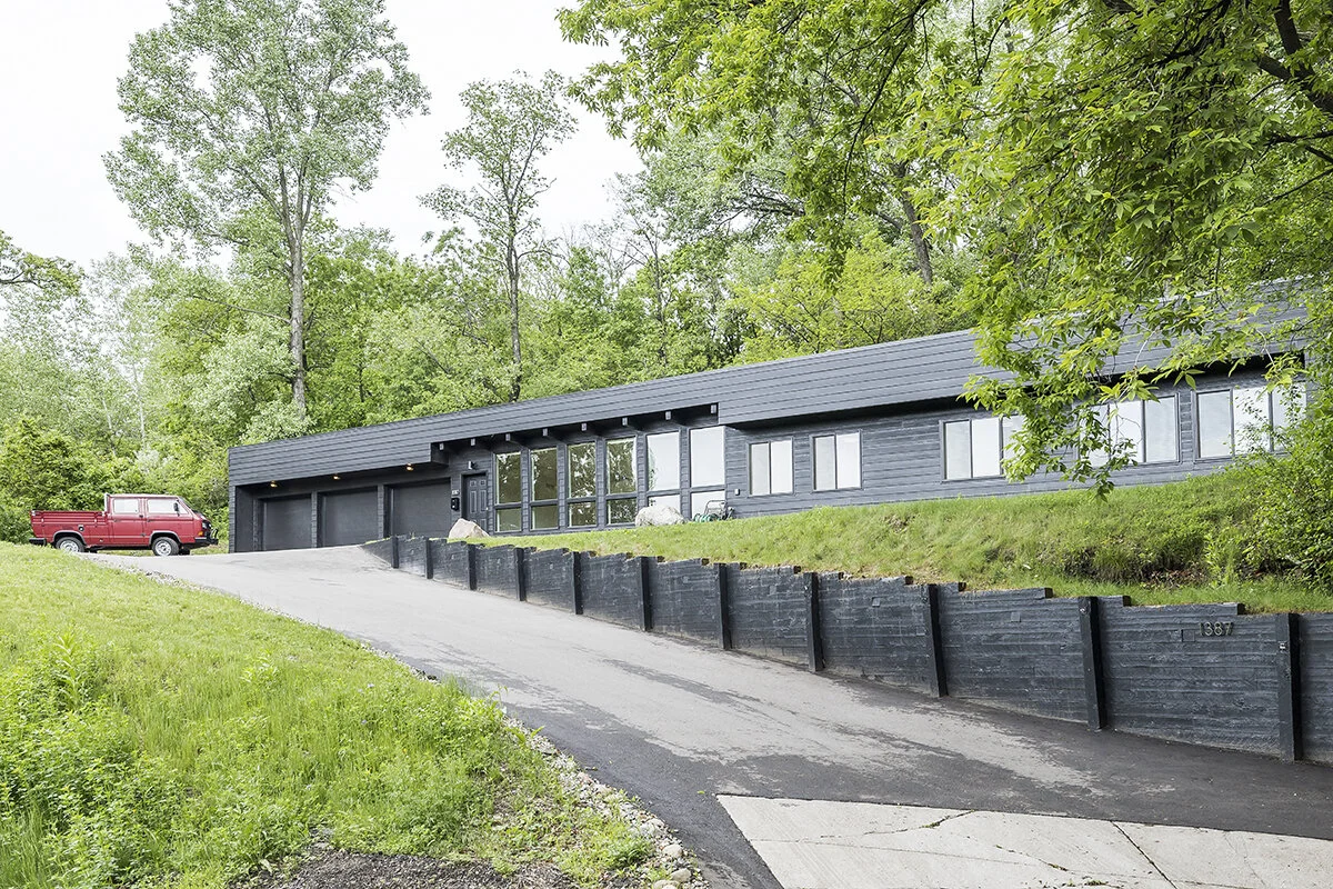 Tastefully updated contemporary earth-home perched up high and very private, not MCM but may appeal to that buyer. The home features a large living space with south facing windows and a wood burning stove, bamboo floors throughout, large master bedroom suite, large attached garage, new cement siding 2018, roof 2018, central air 2019, driveway 2019 and much more.